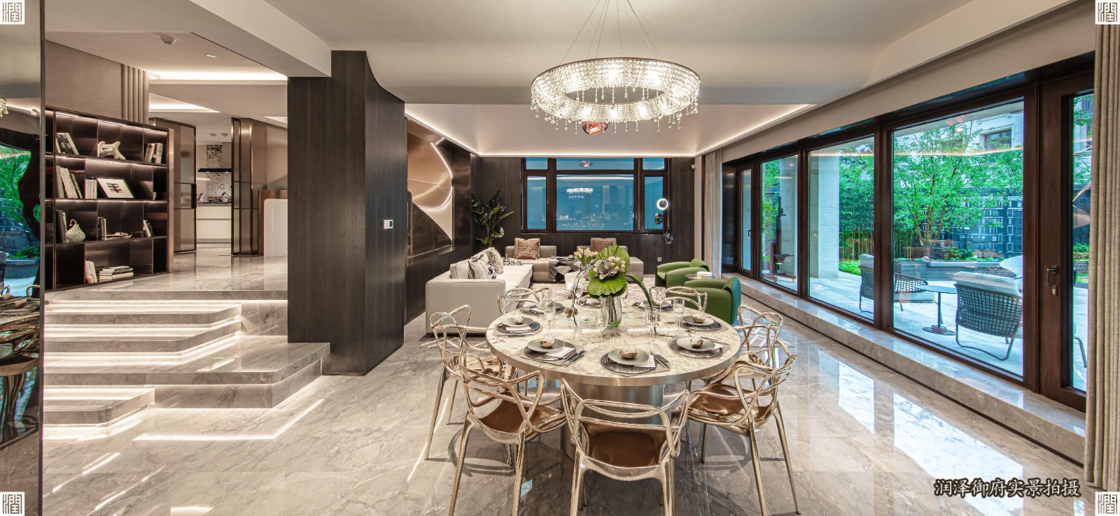 样板间的独特光彩,处处闪耀,例如:客厅空间,尺度恢弘,进退有序;家族花园层,让家庭厅、餐厅,与户外的花园融合一体,将自然景观引入室内,实现坐于室内而见天地自然的四季风景;庭院模山范水,现代简约,让室内室外浑然一体,无论商务宴请亦或家庭聚会,皆有非凡礼仪风范。在整体设计概念和空间组织下,一系列生活情境次第衍生,于细节中暗藏惊喜,重新定义了现代奢居体验。