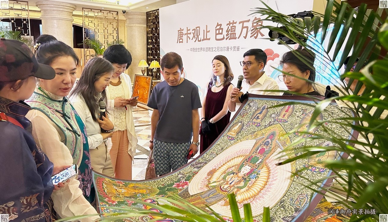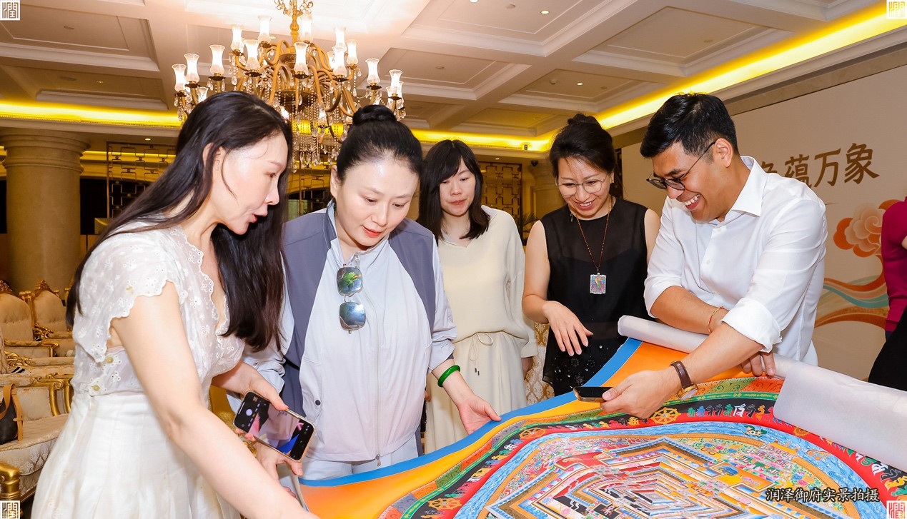 到场嘉宾凝神聆听德亚院长解读唐卡背后的源流、度量与精神象征,从《曼陀罗》的神圣秩序到《释迦牟尼涅槃》的恢弘庄严,于一纹一理中感悟信仰之力,现场每一幅唐卡皆配以精美立牌,详述其寓意与象征。鉴赏之余,嘉宾们或于茶歇雅叙间交流心得,或驻足画作之前,细品天然矿物颜料历经岁月仍璀璨夺目的艺术生命力,领略到世界非遗艺术的震撼之美。